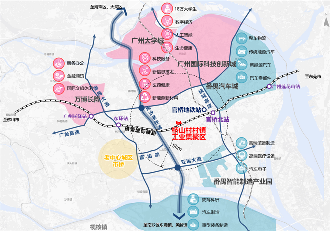 桥山村村镇工业集聚区位于番禺区中部,地理位置优越,周边交通网络发达,半小时通勤圈内可抵达番禺广场、长隆万博、国际创新城等核心板块。